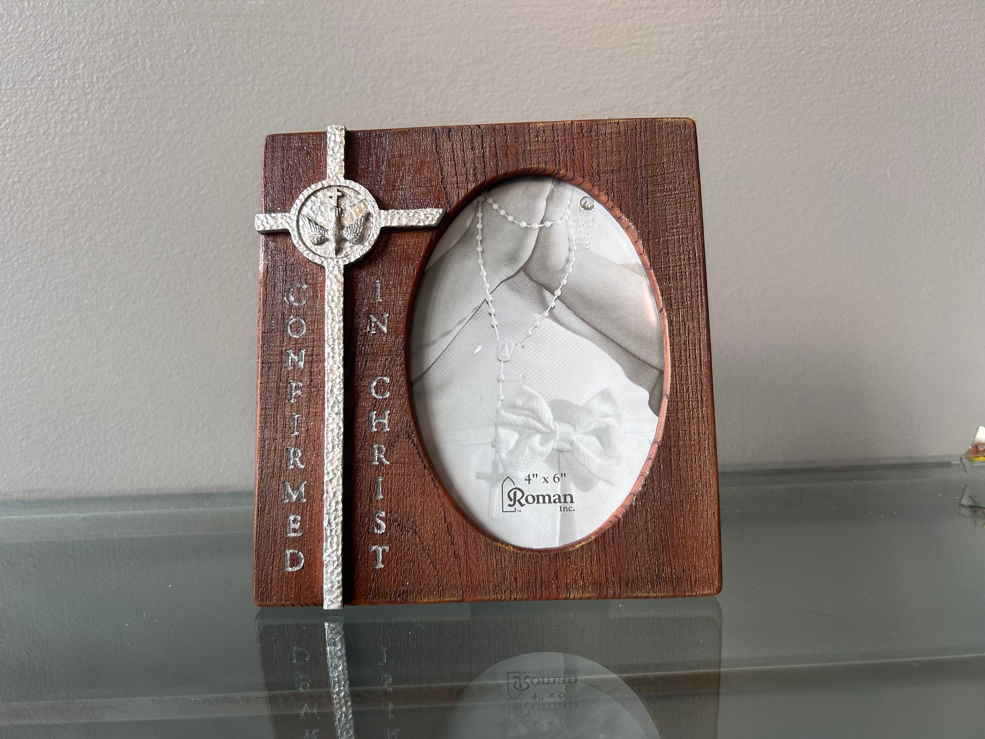 Designed to showcase 4x6 photos, this 6.75-inch high confirmation frame offers a precise and elegant display solution. Its quality craftsmanship ensures durability and protection, making it an ideal choice for preserving and presenting important confirmation memories with professional sophistication.