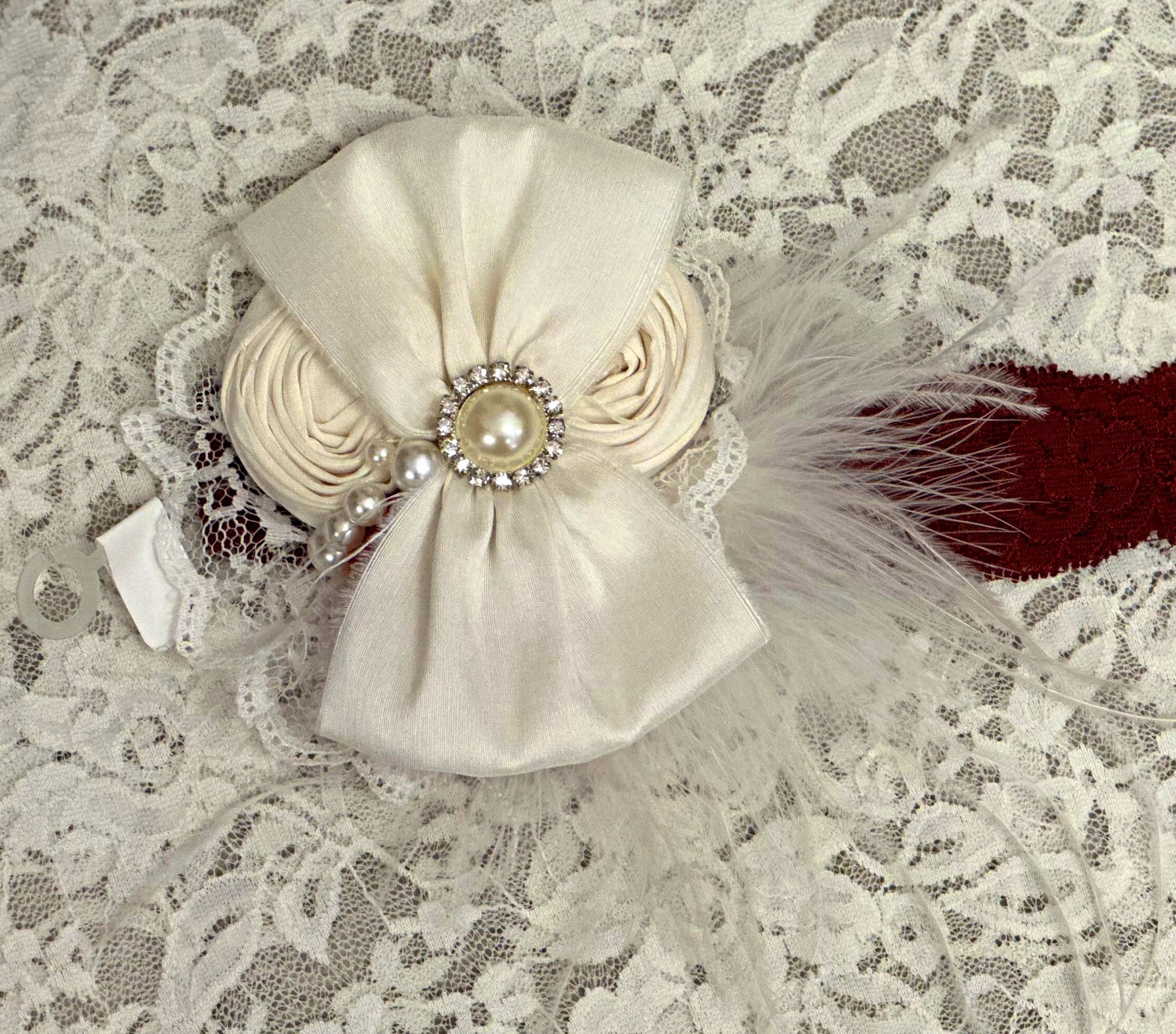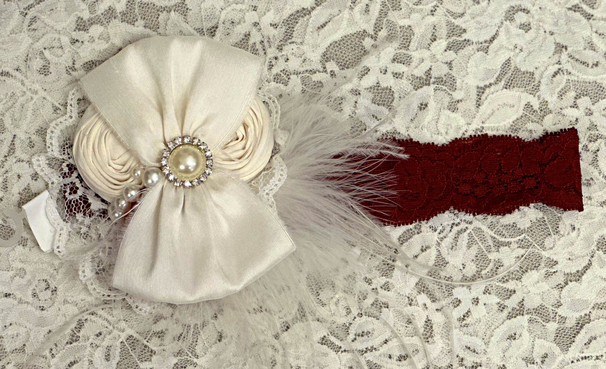 Burgundy Lace Headband with Silk Bow, Rosettes, Flowers