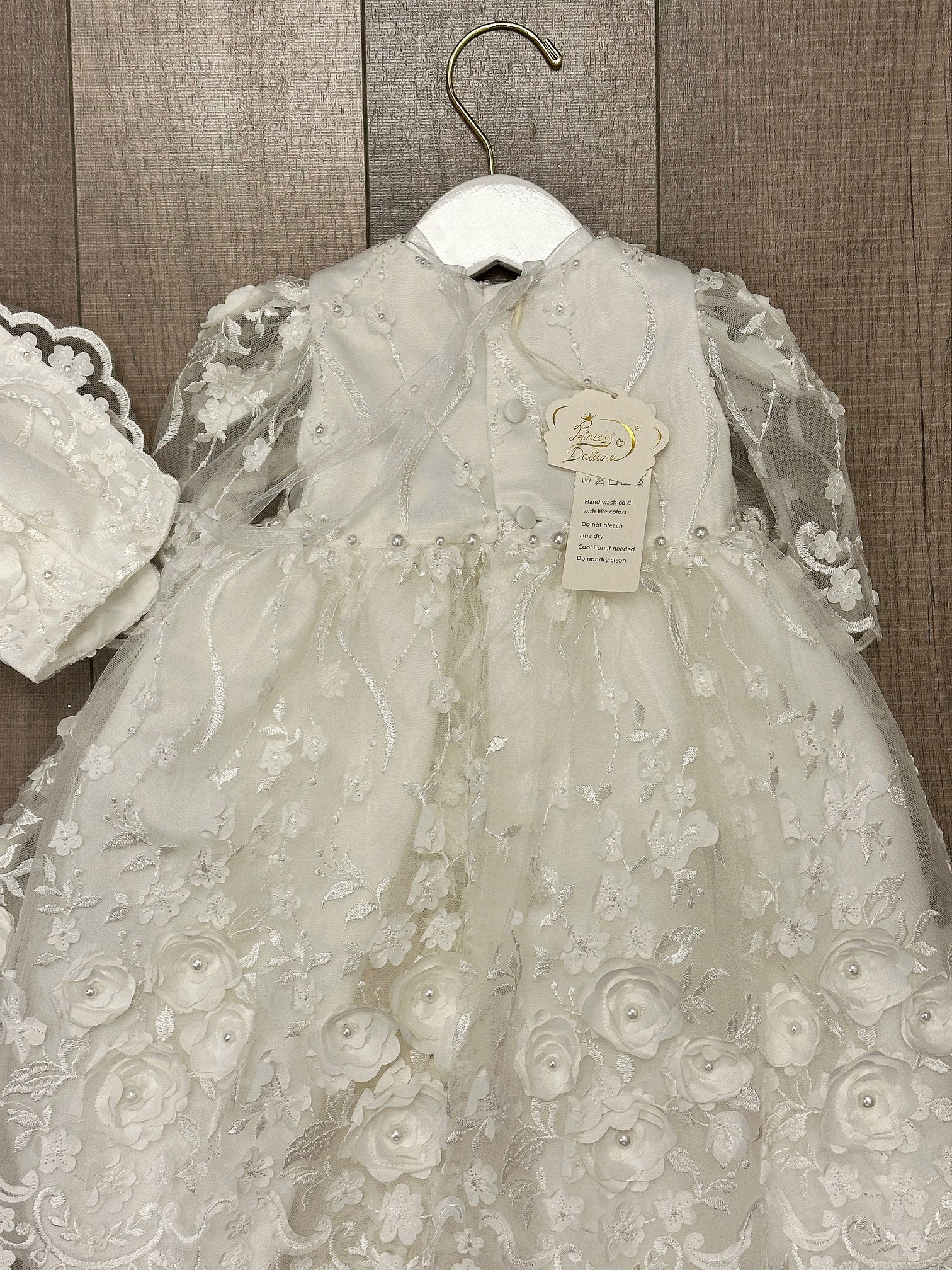 P.Daliana Embroidered Dress w/Floral Applique/Bonnet